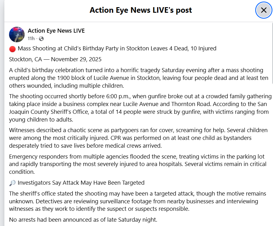 Local leaders — including Stockton’s Vice Mayor and Mayor — confirmed the gathering was a birthday celebration, and expressed grief upon learning that children were among the dead and wounded. Authorities described the incident as possibly targeted, though they have not yet disclosed a motive or identified a suspect. The investigation remains very much ongoing.