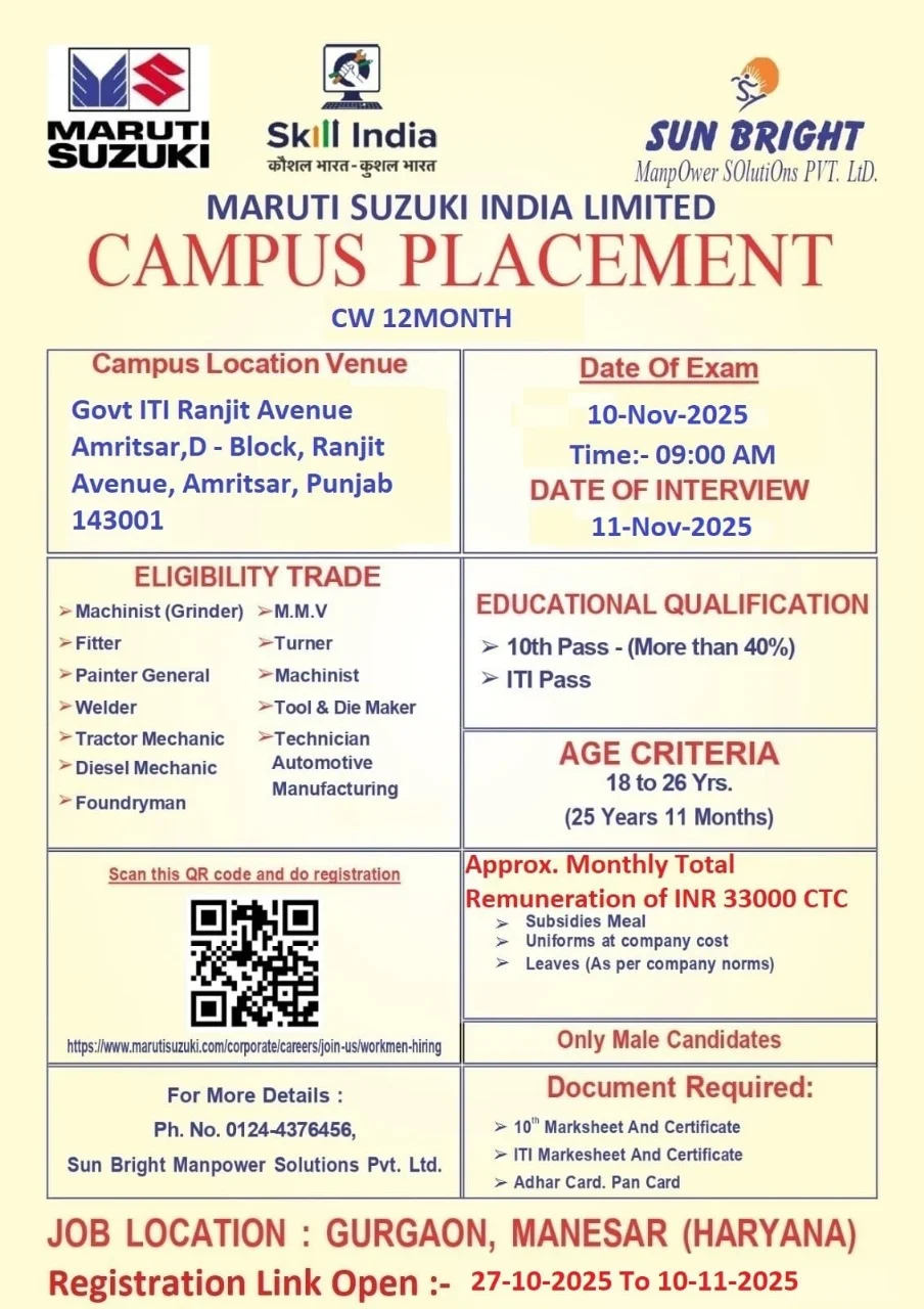 Maruti Suzuki Campus Placement 2025 has been officially announced for ITI-qualified candidates through offline mode. The placement drive will be held at Govt ITI Ranjit Avenue, Amritsar. My name is Satya M. Raj from Bihar, and today I’m sharing this valuable update for job seekers preparing for industrial campus recruitment. Many aspirants miss deadlines, so make sure to apply and attend the exam on time!