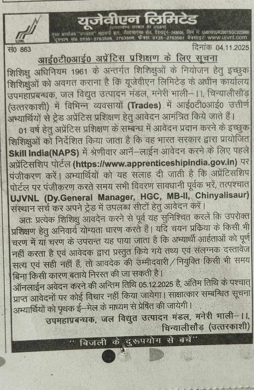 Candidates who have completed ITI in any relevant trade from a recognized institute under NCVT or SCVT are eligible to apply. The UJVN Limited Apprentice program is a great opportunity for fresh ITI graduates to gain practical industry exposure in the power sector of Uttarakhand.